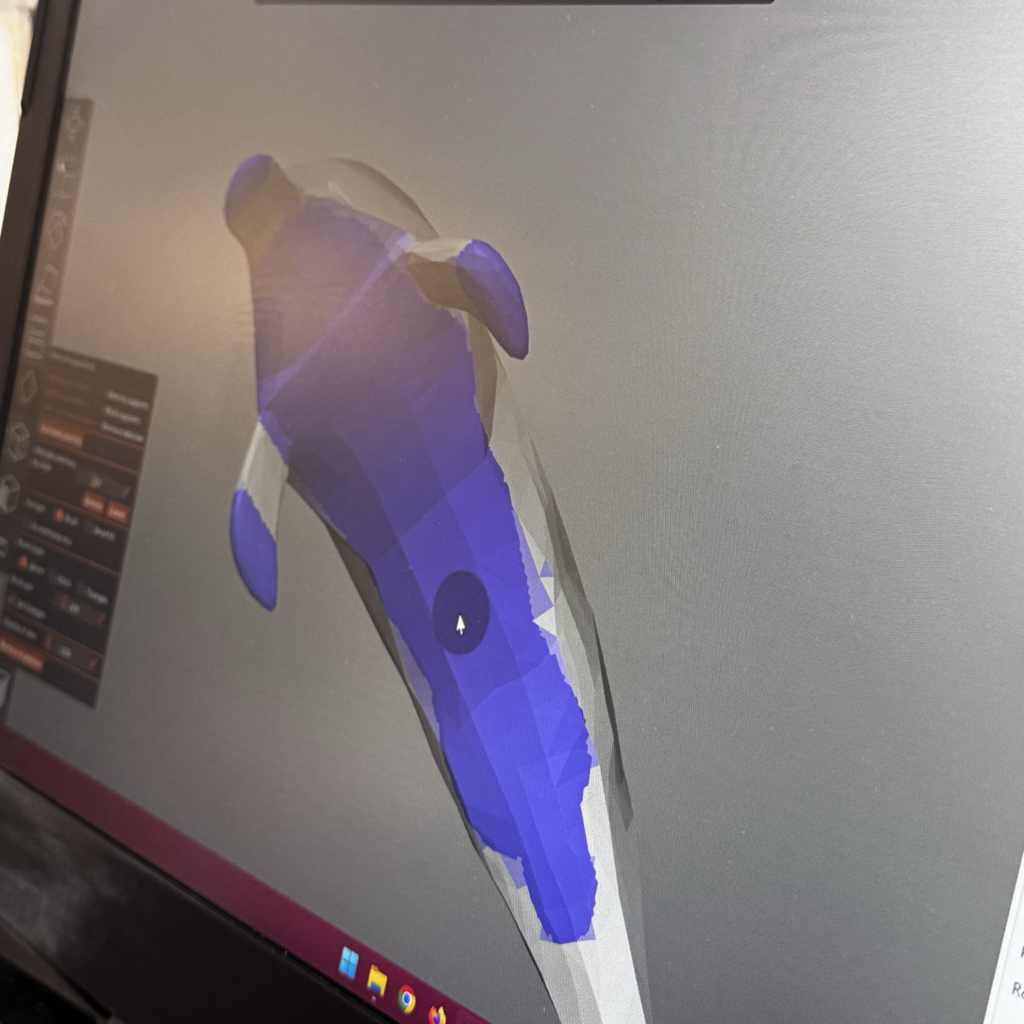 We zagen dat in de bibliotheek van Trellis al een aantal basisontwerpen zitten. Dat helpt blijkbaar. Toch wilden we kijken wat er gebeurt als we een ander plat plaatje invoeren wat niet in de bibliotheek staat. Dus we importeerde een eerder gemaakt afbeelding van een dolfijn (Chatgpt maakte de prompt die we invoerden in een tekenprogramma wat chatgpt adviseerde) in Trellis. Bij deze test maakt hij een erg platte dolfijn, maar de dolfijn had dikte! En wat bijzonder was, de flipper van de dolfijn had een bochtje, dat had Trellis wel zelf vertaald. Dit ontwerp van de erg smalle dolfijn konden we in de slicer dikker maken, waar nodig is ondersteuning toevoegen en printen. En dan is dit het resultaat. Bij de print zie je dat de print-ondersteuning nog aan de dolfijn zit.